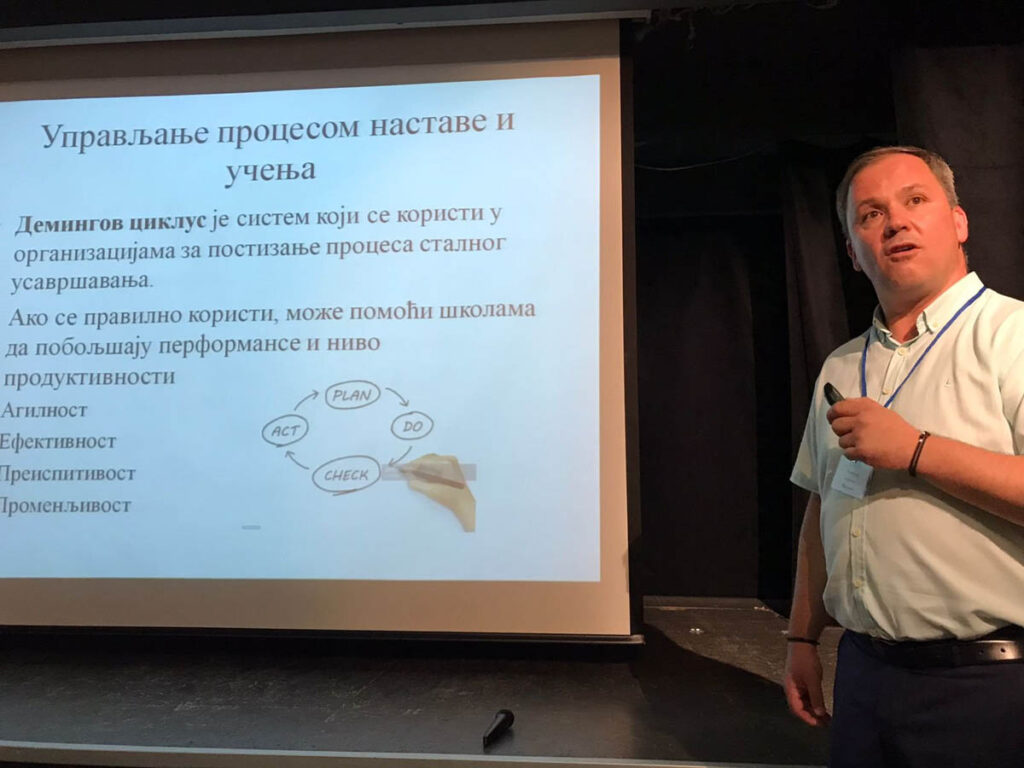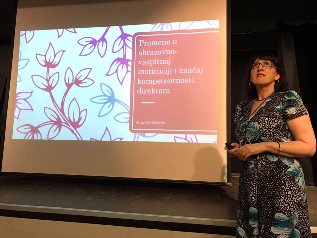 Предавачи су били Марија Крнета, виши саветник, руководилац у Сектору за средње образовање у Министарство просвете, науке и технолошког развоја Републике Србије која је говорила на тему ,,Управљање образовним променама на нивоу образовне установе – поглед у жељено стање 2030“, Томислав Алавања, мастер лидерства у образовању, директор Зуботехничке школе у Београду, који је говорио на тему „Лидерство у образовању-Управљање образовним институцијама“ и др Зорица Ђоковић, директорка Техничке школе „Дрво-Арт“ у Београду која је говорила о „Променама у образовно-васпитној институцији и значај компетентности директора – пример добре праксе директора“