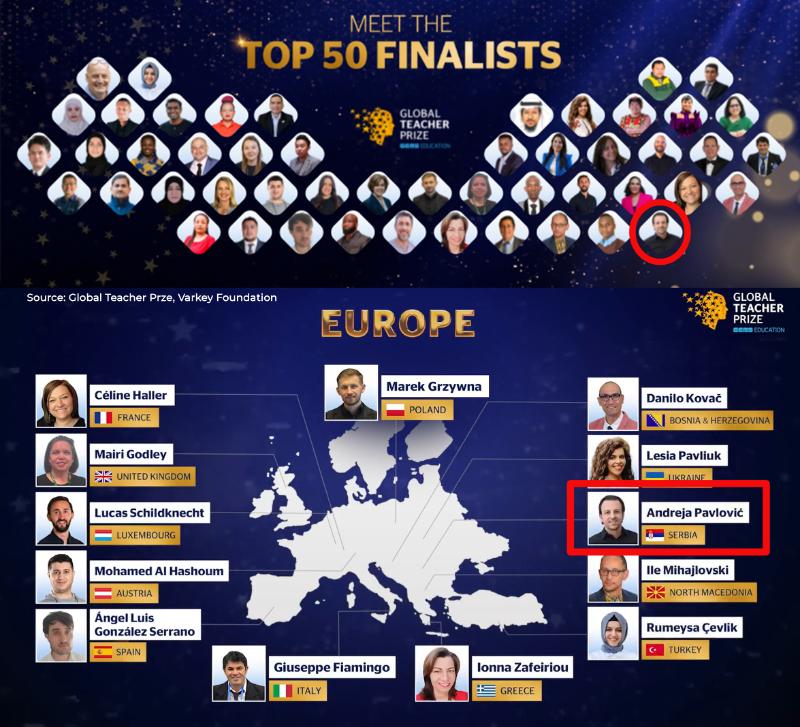 – Globalna nagrada za učitelje, Global Teacher Prize, koju dodeljuje Varkey Foundation u saradnji sa UNESCO-om, objavila je danas da je finalista srpske nagrade za najboljeg nastavnika Prosvetitelj i nastavnik matematike u osnovnoj školi dr Jovan Cvijić iz Smedereva, Andreja Pavlović, izabran u 50 najboljih nastavnika na svetu.