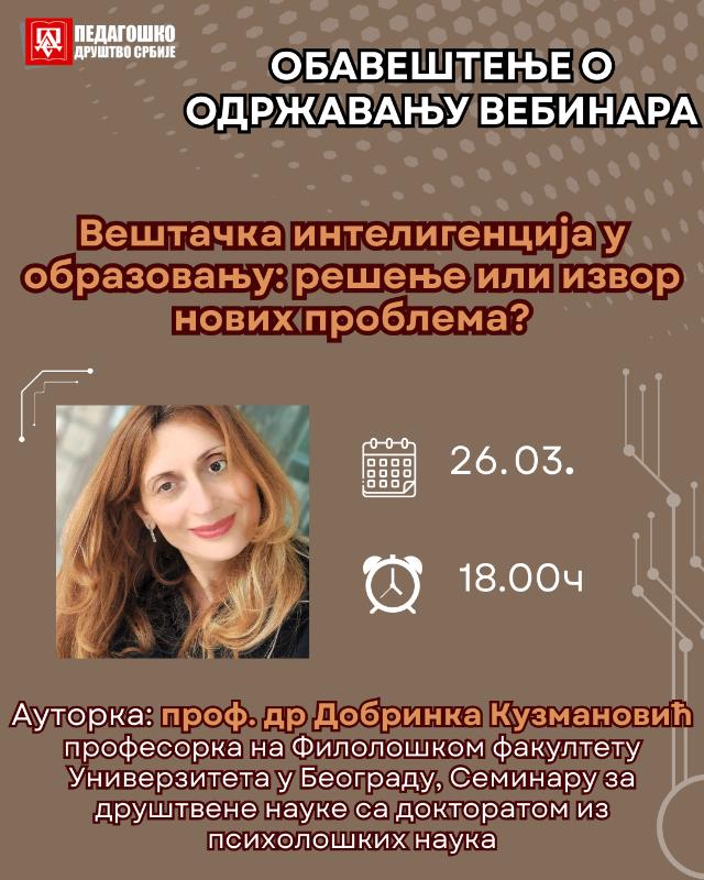 Обавештавамо вас да ће се у четвртак, 26. 03. 2026. са почетком у 18.00ч одржати вебинар на тему „Вештачка интелигенција у образовању: решење или извор нових проблема? ” онлајн, путем Зум апликације.